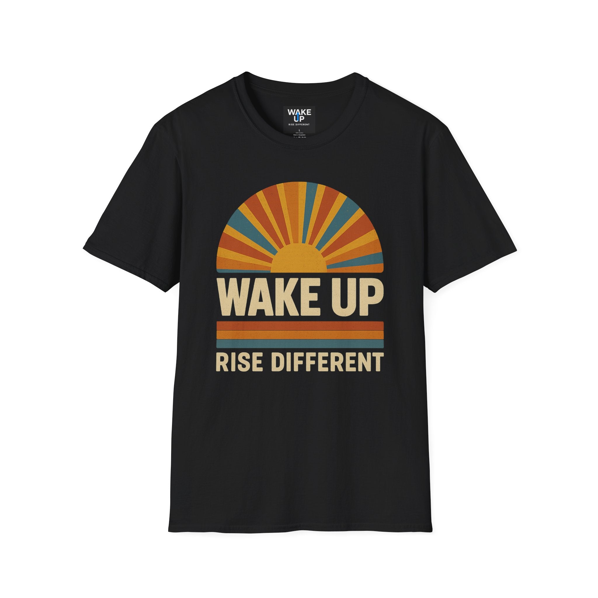 Commencez la journée avec audace et originalité grâce à ce t-shirt d'inspiration vintage « Wake Up – Rise Different » . Orné d'un motif soleil vieilli aux tons orange chauds, bleu profond et jaune soleil levant, il incarne l'esprit du nouveau départ et de l'expression de soi sans complexe.